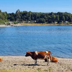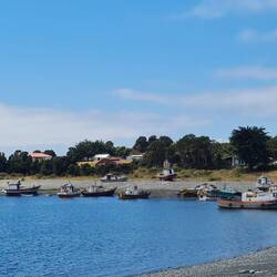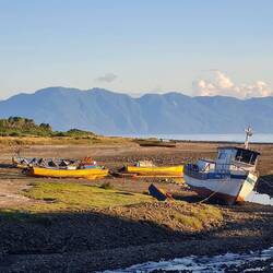 Auf den letzten 50 Kilometern bis Puerto Montt folgen wir einer Bucht, die uns wie aus einem Bilderbuch von vor 100 Jahren erscheint: Bunte Holzboote liegen bei Ebbe im Schlick, hin und wieder durchfahren wir kleine Fischerdörfchen, eine kleine Werft für Holzboote reiht sich an der nächsten. Am Strand werden Muscheln gesammelt. Die Uhren ticken langsamer.