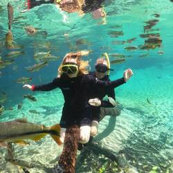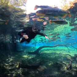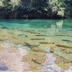Heute steht Schnorcheln im Rio da Prata auf dem Programm. Alles ist sehr gut durchorganisiert, so dass meine Nervosität wegen meiner fehlenden Portugiesischkenntnisse obsolet ist. Erst bekommt unsere 10-köpfige Gruppe eine Sicherheitseinweisung, dann werden die Neoprenanzüge und Schuhe ausgeteilt. Bitte anziehen! Unsere Kleidung kommt in einen großen Sack und verschwindet aus unseren Augen: Sie wird für uns am Ende der Tour bereit stehen. Im Neo wandern wir über das Gelände. Ich muss an das Sams denken, nur die Wunschpunkte fehlen - dafür schwitzen wir im schwarzen Gummi ordentlich. Wir besteigen einen offenen LKW und werden zum Einsatzort gefahren. Jetzt wird klar, warum wir die Neos schon so früh anziehen sollten: Die Kühle des Flusses ist nach dem schweißtreibenden Anmarsch eine unendliche Wohltat! Wir treiben im glasklaren Wasser eines Zulaufs des Rio da Prata, um uns herum Fische, die uns genauso neugierig beäugen, wie wir sie. Der Fluss bestimmt die Geschwindigkeit - tranquilo. Wir beobachten Quellen im Boden, die wie kleine Vulkane aussehen. Rote Fischchen verstecken sich im moosähnlichen Grün am Boden. Die größten Fische haben eine Länge von 80cm. Es fühlt sich an, als würden wir in einem Aquarium schnorcheln. Am Übergang zum Rio da Prata wird das Wasser überraschend deutlich kälter, tiefer und auch etwas trüber. Nach 2 Stunden im Wasser - nur unterbrochen durch eine kleine Wanderung durch den flussnahen Dschungel, um umgestürzte Bäume und Felsen zu umgehen - erreichen wir das Ende der Tour. Während ich noch eine Weile im Wasser stehe kommen Mengen von kleinen Fischchen und verabreichen mir noch eine Wellnessbehandlung: Hautschuppenzupfen.Leer más