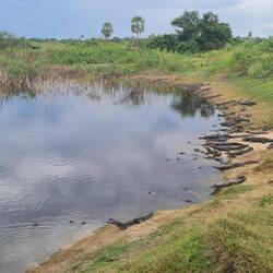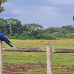 Das Pantanal ist ein Sumpfgebiet an der Grenze zu Bolivien. Jedes Jahr zur Regenzeit bis März wird das Gebiet überflutet, trocknet im Winter bis September dann jedoch sehr langsam wieder aus. Eigentlich sind wir also zur falschen Jahreszeit hier, weil die Tiere, für die das Pantanal bekannt ist, vor allem in der Trockenzeit an den letzten verbliebenen Tümpeln zu sehen sind. An sich erscheint uns das südliche Pantanal aber nicht sehr nass, obwohl es zwischendurch heftig regnet; es kommt uns eher wie eine von Landwirtschaft - vor allem Rinderhaltung - geprägte Graslandschaft vor, die nur selten von Wäldern unterbrochen wird. Trotzdem bekommen wir bei unserer Schleichfahrt auf unbefestigten Pisten viele Tiere zu sehen. Das Highlight sind zwei Riesenotter, die wir von einer der vielen Holzbrücken aus beobachten.Leer más