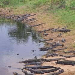 Endlich ... es ist Freitag! Und tatsächlich können wir, wie verabredet, um 11:00 Uhr an Bord des Pontons fahren. Hinter uns fährt noch ein Defender auf den Schwimmkörper, dann wird rund um die Fahrzeuge und auf dem schiebenden Boot alles Mögliche verladen: Dieselfässer, ein Anhänger für einen Trecker, säckeweise Kartoffeln, Verkleidungspaneele für Feuchträume, Campinggestühl, Möhren in Kisten, Ziegelsteine, Fliesen, Zement, Viehfutter, eine Schwangere mit ihrer Mutter, 8 Bewohner einer Fazienda und, und, und ... . Nachmittags gegen 16:00 Uhr sind die Schauerleute fertig und es geht los. Der schiebende Kahn hat zwar schon bessere Zeiten gesehen, doch da wir nicht wissen, dass diese seine letzte Reise sein wird, freuen wir uns und sind unbesorgt. Nach ½ Stunde wird ein Keilriemen gewechselt; kann vorkommen. Doch wir sind gerade eine Stunde unterwegs, da dreht der Kahn und wir kehren nach Corumbá zurück. Getriebeschaden! Im Hafen angekommen, beobachten wir das lebhafte Treiben der lokalen Bevölkerung, während innerhalb der nächsten 3 Stunden das Boot wieder flott gemacht wird. Neustart! Wir schippern durch die Dunkelheit. Da es trotzdem noch sehr heiß ist und die Mücken auf dem Kriegspfad sind, gehen wir früh in unsere Kammer. Die Klimaanlage funktioniert nicht, der Strom ist ausgefallen ... es wird nicht das letzte Mal sein. Gegen 3 Uhr nachts werde ich plötzlich wach: Es ist komplett still ..., ... , ... . Der Motor und die Pumpen sind aus. Es dauert nicht lange, da hören wir die typischen Geräusche von Reparaturarbeiten: Hämmern, Klirren, Dengeln. Es wird das Notstromagregat angeworfen, damit die Pumpen wieder arbeiten. Es wird nicht das letzte Mal sein. Nach 2 Stunden geht die Reise weiter, jetzt auch wieder mit Strom. Doch gegen Mittag des nächsten Tages steuert der Kapitän unseren Seelenverkäufer schon wieder in die Böschung. Motorschaden! Es dauert nur 2 Stunden, dann ist der Mechaniker aus Corumbá mit dem Schnellboot zur Stelle; nach weiteren 2 Stunden Reparaturarbeiten tuckert die Amolar wieder den Rio Paraguay aufwärts. Der Mechaniker bleibt noch ein paar Stunden an Bord, zur Sicherheit. Die Stimmung ist bei der Besatzung deutlich besser und wir denken schon, dass jetzt nichts mehr ausfällt, da geht der Motor wieder aus und kann nicht wieder gestartet werden. Der Schubverband verliert den Schwung und treibt dann stromabwärts, während der Schiffseigner das Schiff verlässt, um von der nahen Fazienda schnell eine Batterie zu organisieren. Der Motor springt wieder an. Beim Auto hieße es jetzt, dass die Lichtmaschine kaputt ist und deswegen die Batterie nicht mehr geladen wird. Jedenfalls läuft ab nun dauerhaft ein Notstromaggregat und der Starlink wird wegen zu hohem Stromverbrauch ausgeschaltet. Später fällt noch die Lenzpumpe aus, ein zweites Notstromaggregat mit Pumpfunktion arbeitet zuverlässig, wenn auch ohrenbetäubend.
