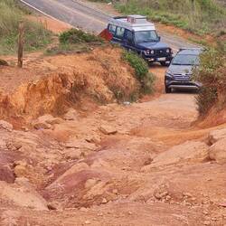 Der Pass ist mühsam. Die sowieso schon schmale Strecke ist übersät mit Erdrutschen, Flüsse rauschen über den Weg, hin und wieder ist die Straße zum Abhang hin weggebrochen, aber nie dramatisch. Es regnet in Strömen. Wir kommen nur langsam voran, zum Glück haben wir keinen Gegenverkehr. Das sollte uns eigentlich stutzig machen, wir schöpfen jedoch keinen Verdacht. Doch dann, welch' Überraschung, kommt uns ein Overlander entgegen, hält direkt neben uns und wir erfahren, dass der Pass gesperrt ist, weil an dem Morgen eine Brücke durch den Regen unterspült wurde. Kein Durchkommen! An Furten nicht zu denken! Er musste umdrehen. Wir wenden und beschließen, einen anderen, südlichen Pass, dann schon in Ecuador, anzufahren. Per WhatsApp informieren wir Hans, der uns mitteilt, dass die Querung in der Höhe von Quito wegen eines Erdrutsches auch gesperrt ist. Als wir ihm schreiben, dass wir den Pass auf ecuadorianischer Seite an der Grenze zu Kolumbien nehmen wollen (also weiter nördlich), bekommen wir die vielsagende Antwort: "Ihr habt 'nen HZJ? Müsste gehen."