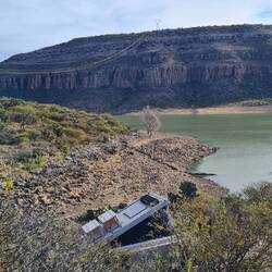 Unser nächster Schlafplatz überrascht mit einer ausgesprochen anspruchsvollen An- und Abfahrt: mit Rinnen versetzt, schmal, steil und steinig brauche ich 45 Minuten abwärts. Den Stausee, der das Ziel sein sollte, können wir nicht erreichen, da am Ende auch zu Fuß kein Durchkommen mehr ist. Bei der Rückfahrt bergauf springt ein Baum nicht rechtzeitig zur Seite und rammt Grobi mit einem Ast. Das Geräusch ist hässlich. Grobis Beule muss später behandelt werden.
