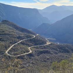Anschließend geht es hoch ins Bergland. Wir nehmen die gewundene mautfreie Strecke, weil wir so über eine kurze Rumpelpiste in einen Washout (Arroyo) zum Übernachtungsplatz finden. Ein Blick auf die Wettervorhersage für die Sierra Madre sagt uns, dass das Flussbett trocken bleiben wird.
