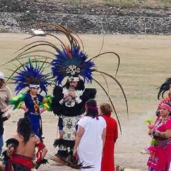 Mehrere Stunden verbringen wir auf dem Gelände, gehen an der Sonnenpyramide, die die drittgrößte Pyramide der Welt ist, entlang und wandern auf der Avenida de los Muertos bis zur Mondpyramide, die zwar deutlich kleiner ist als die Sonnenpyramide, aber etwa die gleiche Höhe erreicht, weil sie auf höherem Terrain steht. Leider ist es nicht mehr erlaubt, die Pyramiden zu besteigen. Bei der ungeheuren Anzahl der jährlichen Besucher - bis zu 4,1 Millionen - können wir das Verbot gut verstehen. Wir laufen statt dessen zum Tempel von Quetzalcóatl, einer Gottheit, dessen Name aus der Sprache der Nuahatl mit "gefiederte Schlange" übersetzt wird, und bekommen so einen Eindruck von der Ausdehnung der Stadt, von der erst 5% ausgegraben worden sein soll. Im Museum bestaunen wir die filigranen Figürchen und die unzähligen Artefakte.