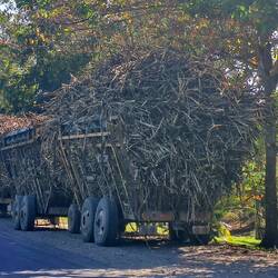 Noch in Oaxaca versuchen wir zum ich-weiß-nicht-wie-vielten Male von der Werkstatt zu erfahren, wann die Dichtungsringe denn nun in San Miguel de Allende ankommen. Da die Antworten vage bleiben, wenden wir uns an den Besitzer Matthias, der gerade in Deutschland weilt, und beschweren uns. Das ist insofern bemerkenswert, da wir äußerst ungern ungemütlich werden. Aber es hilft! Matthias wird die Ersatzteile, die tatsächlich noch nicht bestellt sind, von Deutschland mitbringen, so dass der Rückkehr- und Reparaturtermin jetzt endlich steht: 12.02. . Dadurch können wir die Reiseroute zurück planen und da Jörg gerne den Golf von Mexiko sehen möchte, geht es also gen Norden und in die schon erwähnte Welterbestätte Tlacotalpan. Der Weg dorthin führt über eine wunderbar gewundene Passstecke, dem Jaufen ähnlich, doch mit 220km fast 6× so lang. Nach wochenlanger Trockenheit von Himmel und Erde mit viel Staub und graubrauner Farbgebung in der Natur, empfängt uns die Nordseite ausgesprochen feucht und mit sagenhaften Grünschattierungen: Farne groß wie Bäume, Flechten lang wie Bärte und überall Tillandsien. In der Ebene geht die Fahrt durch Zuckerrohrfelder. Die Ernte ist in vollem Gange, die Erntewagen beeindruckend lang und hoch beladen.