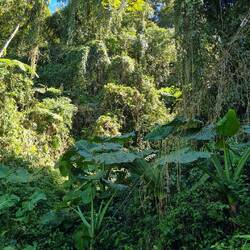 Der Weg führt uns zunächst durch Palmölplantagen ... Monokulturen mit den bekannten ökologischen Problemen. Doch dann, mit der zunehmenden Höhe, wandelt sich das Bild: Die Hänge der Berge sind dicht mit Regenwald überwuchert, die Vielfalt der Grünpflanzen und ihrer Aufsitzer ist faszinierend! Der Weg wird schmal, wir erreichen die Wolkenuntergrenze und kurze Zeit später erleben wir den ersten Regenguss seit Monaten. Regen! Ich hätte nie gedacht, dass ich mich darüber freuen kann.