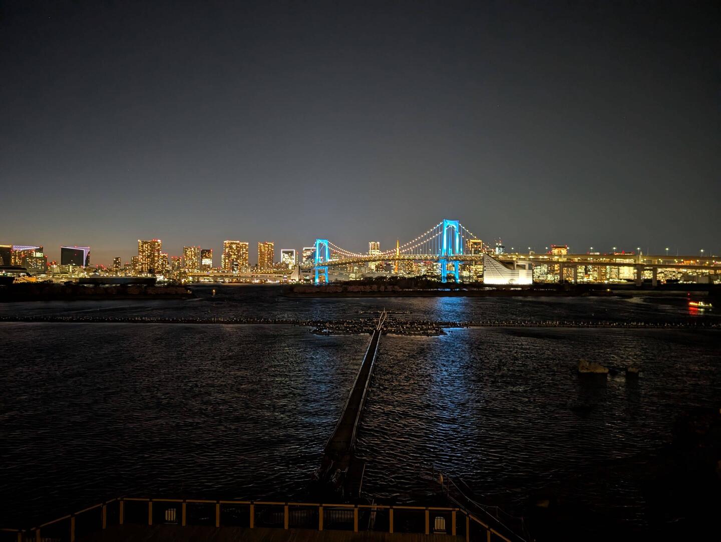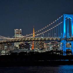 Blick über die Bucht von Tokio mit Rainbow Bridge und Skyline