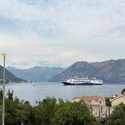 Na een heerlijke nacht rijden we op aanraden van onze host naar een lokale bakkerij waar we twee lekkere soort van boule de berlin’s kopen. We ontbijten op het terras van onze airbnb met een prachtig uitzicht over de baai van Kotor met zicht op enkele cruise schepen. Onze host maakt een heerlijke Turkse koffie voor ons klaar, zoveel gastvrijheid hebben we nog nooit mogen ervaren. Als onze magen gevuld zijn gaan we voor een heerlijke zwemsessie in de baai. Rond twaalf uur vertrekken we richting Perast. Als we de boekjes mogen geloven is het een echte kattenstad.