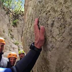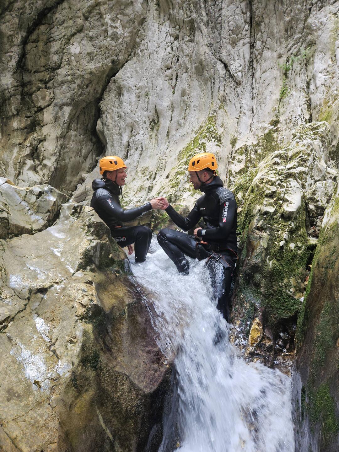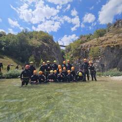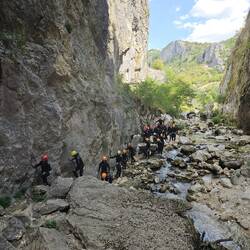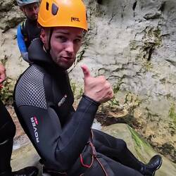We ontbijten met een lokale specialiteit, de naam zijn we alweer vergeten, maar het is een soort van fijn opgerold bladerdeeg gevuld met spinazie en kaas. Heel lekker en we staan er stevig op! Dat moet ook vandaag want om kwart voor 10u komen ze ons ophalen voor een dagje canyoning. Jammer genoeg komt er niemand opdagen en er gaat al snel een halfuurtje voorbij. Uiteindelijk daagt er om 10u30 een busje op en kunnen we vertrekken. De chauffeur is erg gehaast en steekt iedereen voorbij, ook in de bochten. Niet veel later komen we aan bij de start van de canyon waar de rest van de groep op ons wacht. We trekken snel dikke wetsuits aan want het water in de canyon is maar 7 graden. 🧊 We krijgen ook een helm en een harnas. De drie gidsen geven ons wat uitleg, maken snel een groepsfoto en nadien kunnen we vertrekken. We nemen meteen initiatief en gaan als eerste de canyon in, een goede keus want onze groep bestaat uit 16 personen en zo hoeven we nooit in de rij te staan 🙂.