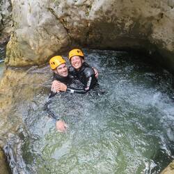Het tempo ligt vrij hoog en we navigeren vlot door het eerste stuk van de canyon. Het begin is vrij eenvoudig met veel slides over de rotsen of kleine sprongetjes. We steken meteen een andere groep voorbij. Daarna begint het tweede deel waarbij de grotere sprongen komen. We springen van 8m in een diepe blauwe kom. Heerlijk! Ook het zicht in de canyon is de moeite! Soms lijken we wel 100m diep te zitten in de smalle kloof die vaak maar een tweetal meter breed is.