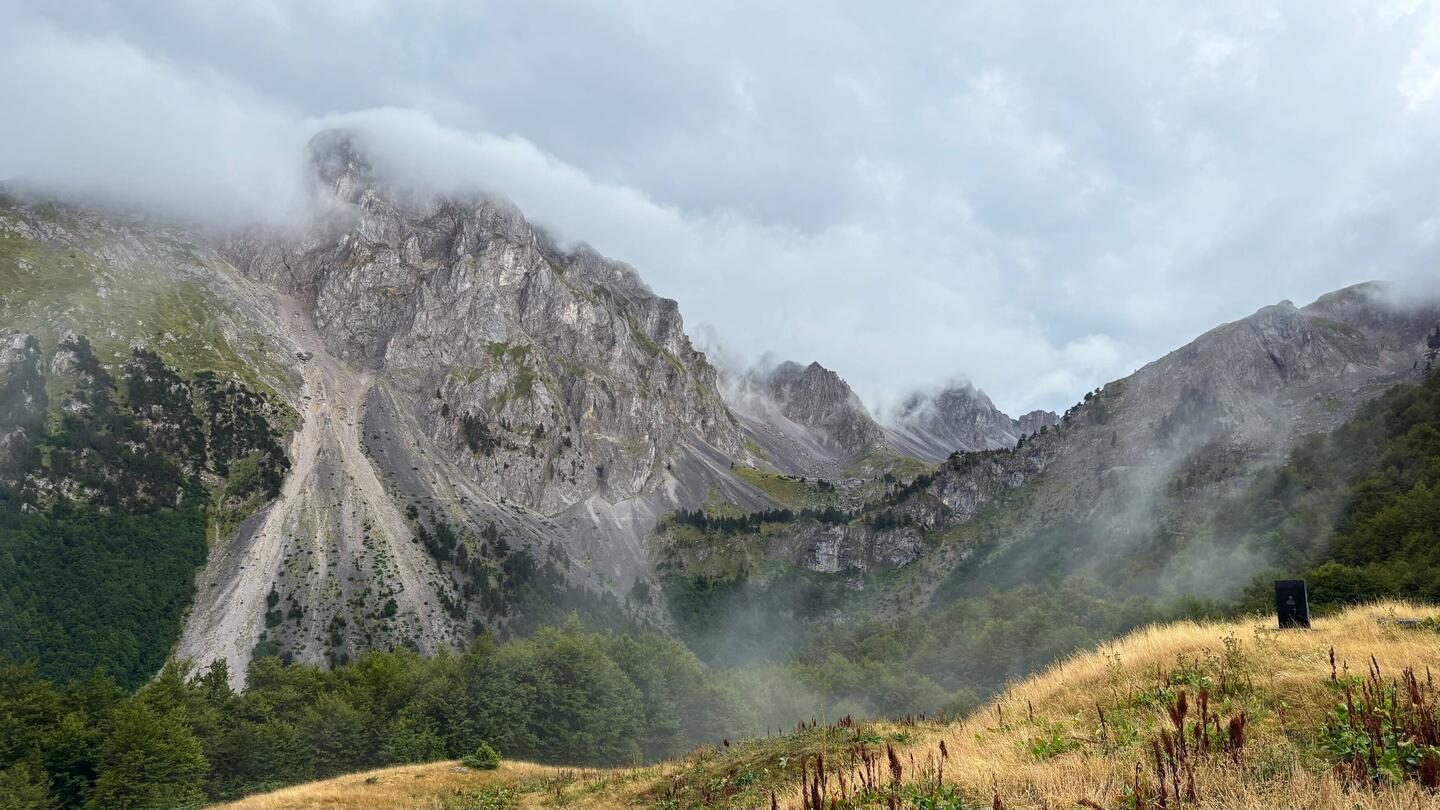 We ontbijten met yoghurt, fruit en musli op het terras van het gesloten restaurant naast de deur. De wolken hangen nog diep in de vallei en van het beloofde goede weer is opnieuw niet veel te zien. We denken nog even na over een alternatief, maar de wolkenlaag lijkt dan toch een beetje op te trekken waardoor we besluiten bij ons oorspronkelijk plan te blijven en vandaag de three peak hike (Maja e Popadijes, Talijanka, en de populaire en markante Valusnica) te beklimmen. Voor we vertrekken maken we nog een praatje met de eigenaar van het restaurant die net aankomt. Net als vele andere inwoners heeft hij familie in New York, ieder jaar komen alle Amerikaanse Montenegrijnen uit de streek terug naar huis in de maanden juli en augustus. Ze verschepen alles in die periode, en dat verklaart ook meteen waarom het hier vol rijdt met dikke Amerikaanse wagens met NY city nummerplaten.