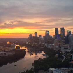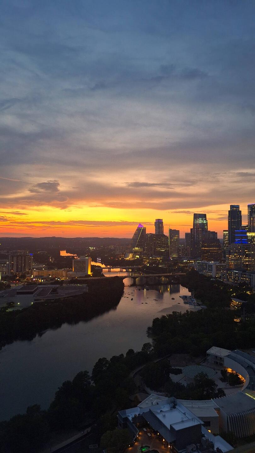 The sun setting behind the Colorado River, lighting up the sky in orange, the color of the Texas Longhorns football team🧡