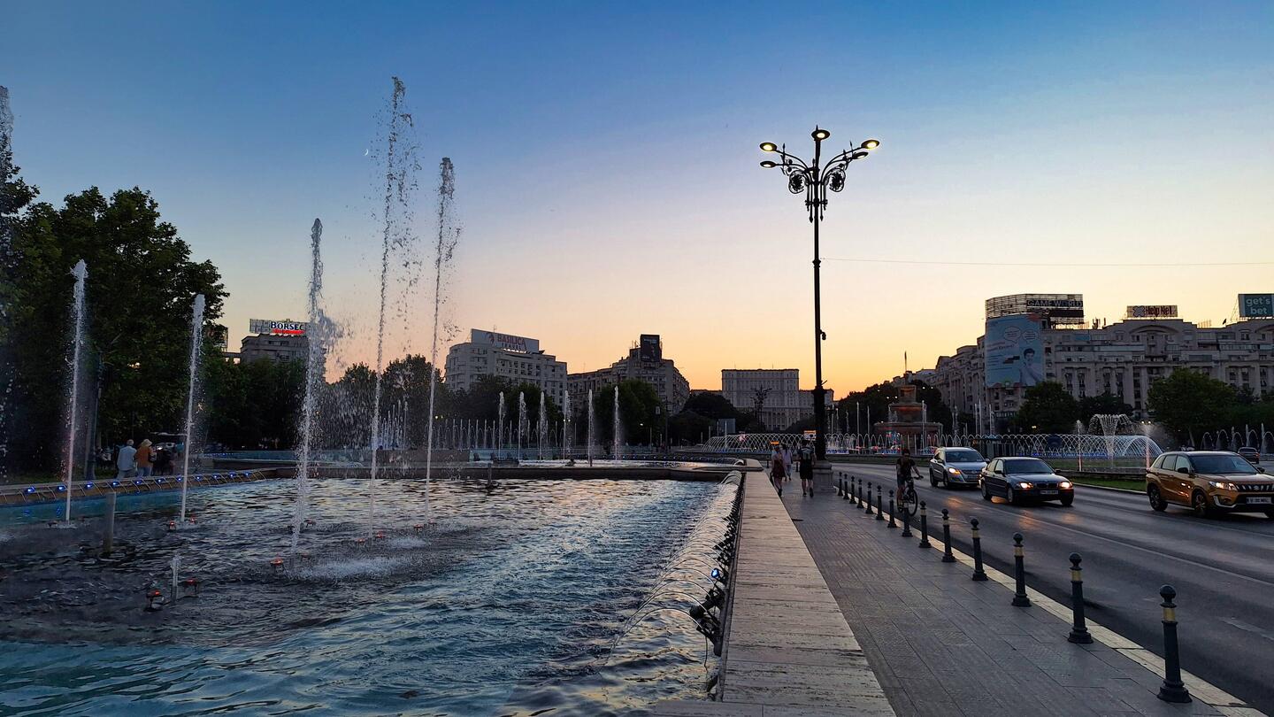 At Piața Unirii, there are beautiful water fountains, also known as the Ceaușescu Fountains, named after the dictator who ruled Romania for over 20 years.