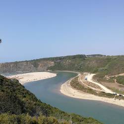Ein wunderschöner Strand bei Aljezur mit einer Dünenlandschaft und einem Fluss, der im Meer mündet.