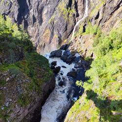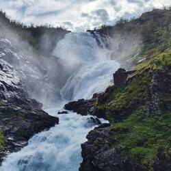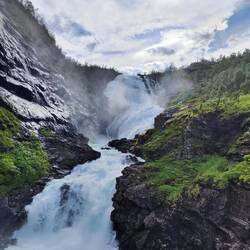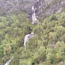 Trenino panoramico da Myrdal a Flam. Un dislivello di circa 860 m co pendenze fino al 55%. Con fermata intermedia a questa stupenda cascata.