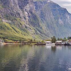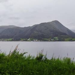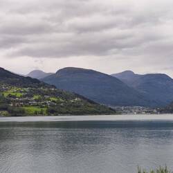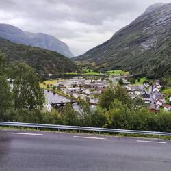 Vista panoramica sul fiordo Utvik. La strada percorre tutto il perimetro del fiordo ed è anche stretta, due autobus in senso di marcia contraria ci passano per pochi cm senza urtarsi.