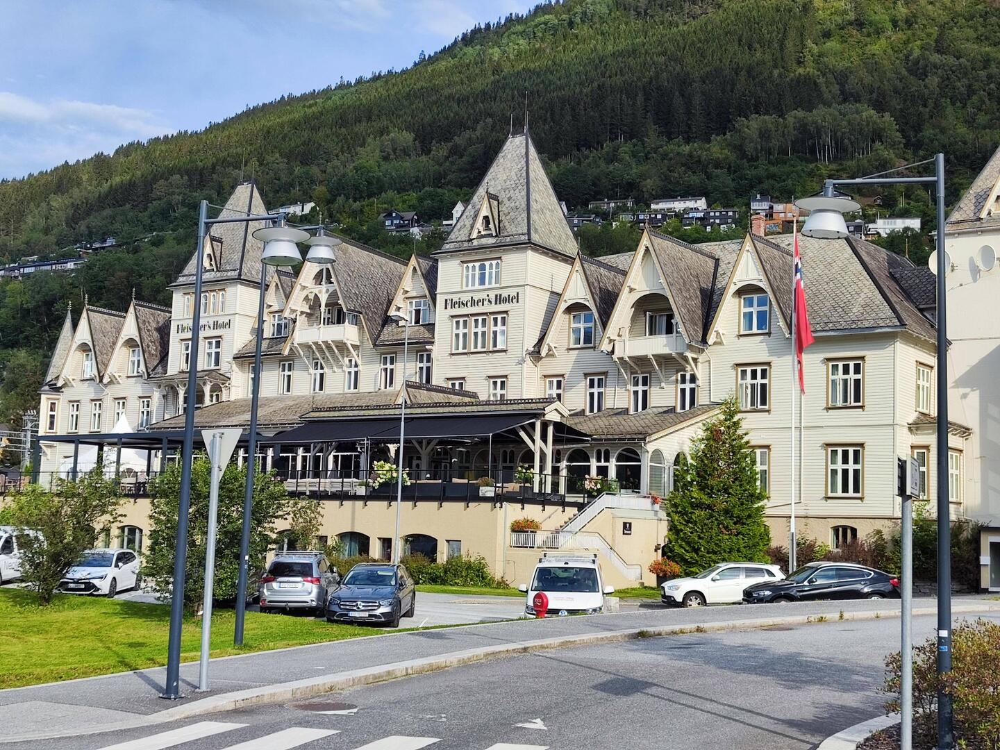 Stamattina partenza tranquilla per la stazione dei treni di Voss, per raggiungere la storica ferrovia che si arrampica fino a 850 metri. Allego foto di un bellissimo hotel.
