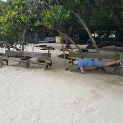 2. Spanische Rentner-Gruppe. Ober Anführerin um alle Ihre Untertanen bemüht, dem Vati fleißig die Glatze einzugecremen und stehts immer die Erste zu sein, saß nun mit mir am Ende des Schlauchbootes von Bartalomè zum Schiff. Das Schlauchboot muss seitlich an dem Schiff parken, sodass wir an der Seite halbwegs entspannt aussteigen können. Ober-Anführerin hat es zu lange gedauert und sie machte einen Satz liegend auf die Reling. Tja, leider war das Boot noch nicht festgeknotet, sodass wir aufgrund Ihres Sprunges mit dem Boot weg geschwommen sind. Nun hing sie wie eine Seekuh über der Reling und kam nicht mehr vor und zurück. Die Crew vom Schiff musste sich dann rüberziehen, wie beim Fischfang. Herrlich! 😂😂Read more