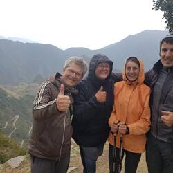Heute früh um 08.00 ging es für uns erneut hoch zum Machu Picchu. Diesmal aber die bequemere Variante mit dem Bus. Die Fahrt entlang der Serpentin war spannend aber wir sind heile hinauf gekommen. Der Anblick war wieder mal atemberaubend und die Sonne war uns auch wohl gesonnen. Zuerst machten wir uns auf zur Inka-Brücke. Man kann es nicht direkt Brücke nennen eher "schmaler Weg am Abhang" aber wir trauten uns. Matze und Ich waren sogar wieder mal besonders mutig und gingen 3m auf der Brücke. Hierbei mussten wir unter einem Felssprung lang aber dies haben wir auch gemeistert. Ja, mein Aufenthalt auf der Brücke dauerte nicht lange und meine Beine waren weich, wie Pudding. Drüber zu laufen oder stehen zu bleiben ist doch etwas anderes. 🙈🙈 Nach der Inka-Brücke ging es direkt in die Stätte und wir besichtigten jeglichen Stein, der dort zu sehen war. Es war super interessant aber würde Ihr viel zu viel Text beanspruchen aber bei dem Fotos angucken, da können wir Euch mehr dazu erklären. 😉 Auch beim Machu Picchu gibt es freilaufende Lamas und Alpakas. Hier habe ich drei fotografieren können. Die Alpakas schimmern teilweise türkis und Lila und tragen sogar Mützen. Dies ist eine ganz seltene Art. Glück gehabt! 😂😂 Nach unserer Erkundung machten wir uns zu Fuß auf dem Weg nach unten. Es ging 1,25 Stunden nur per Treppe bergab. Dies ging etwas in die Kniegelenke aber auch das haben wir mit Bravur gemeistert. Nach unserer Tour sind wir noch zu einem Quellen-Bad gegangen und haben uns bei 39° Wassertemperatur entspannt. Tja, beim Aussteigen hatte es Frau Kipp wieder sehr eilig und flog die Treppe hoch. Dabei stieß ich mir den Zeh, sodass er vorne einen kleinen Riss bekommen hat und blutete. Ich fragte die Dame lediglich nach einem Pflaster und sie holte direkt den Verbandskasten, Alkohol und Handschuhe. Zu erst dachte ich sie hat mich falsch verstanden und will den Zeh amputieren 😂😂 Aber sie reinigte die Wunde und machte mir ein Pflaster drauf. Also uns geht's allen gut und morgen fahren wir nach Cusco zurück. Bis nach Ollantaytambo fahren wir wieder mit dem schönen Zug 😊 und dann holt uns ein Pkw ab. Übermorgen werden wir wahrscheinlich die Regenbogenberge besteigen (5200m) aber dies werden wir morgen mit dem Guide besprechen. Soo schläft schön!