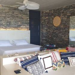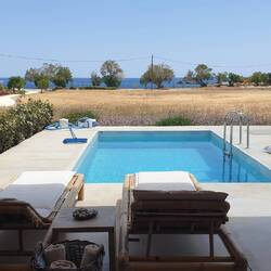 Mit unserer Unterkunft "Akra Gramenno Beachfront Villas" sind wir auch mega zufrieden. Unser kleiner komfortabler 1-Zimmer Bungalow liegt etwa 4 km außerhalb des Ortes mitten in der Pampa und bietet einen sensationellen Ausblick. Hier werden wir insgesamt 5 Tage bleiben.