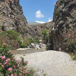 Danach ging es auf der kurvenreichen Straße mit immer wieder spektakulären Ausblicken in die Weißen Berge zurück zur Küste. Besonders schön war am Ende nochmals die Fahrt durch die Schlucht von Thérissos mit ihren fast senkrechten Wänden.Læs mere