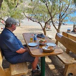 Nachdem ich mich für den Rückweg entschieden hatte, ging es im Sauseschritt wieder nach Sougia zurück, um mit Thomas in einer hoch gelobten Taverne die Mittagspause zu verbringen 😋. Unsere Erwartungen wurden voll erfüllt. Ich schrieb zu der Taverne To Tzitziki folgende Rezension, über die sich der Wirt sehr freute: