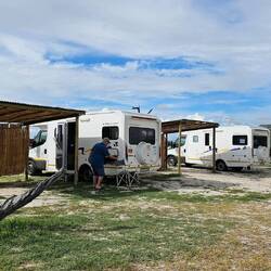 Im Camp hatten wir keinen Strom und so konnten wir natürlich auch unsere Klimaanlage nicht nutzen. Das Thermometer zeigte mittlerweile 37 º im Schatten; im Womo lagen die Temperaturen sogar bei über 40 º. Da macht man nichts anderes als bewegungslos im Schatten zu sitzen und auf einen Windhauch zu hoffen 🥵.