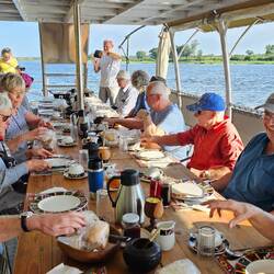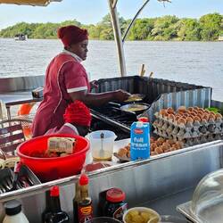 Wir genossen es sehr, wieder mal 2 Tage an einem Ort zu bleiben und einfach mal zu faulenzen. Dafür eignete sich die schön gelegene Mahangu Safari Lodge hervorragend. Nach dem tollen Grillabend wurden wir gestern Abend noch mit einem köstlichen Abendessen verwöhnt. Heute morgen frühstückten wir dann auf einem Boot 🛥. Ganz gemütlich tuckerten wir dabei in schönem Morgenlicht über den Kavango.