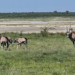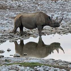 Zwischen den Camps liegen nur rund 100 km, aber aufgrund der schlechten Straßenverhältnisse lag die Durchschnittgeschwindigkeit bei unter 20 kmh und so kamen wir nur sehr langsam vorwärts. Außerdem bleibt man natürlich überall stehen, wo man Tiere beobachten kann. Wir sahen Hunderte von Zebras, jede Menge Gnus, Antilopen, Impalas, Springböcke, Giraffen, Hyänen, zwei Löwen und vieles mehr. Das Highlight waren gestern Abend zwei Nashörner an dem landschaftlich toll gelegenen Wasserloch im Halali Camp. Nun haben wir die Big Five komplett 😁.