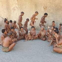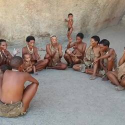 Gestern waren wir zu spät dran um gemeinsam mit unserer Reisegruppe die San (Urbevölkerung von Namibia) zu besuchen. So machten wir uns heute alleine auf den Weg in das Living Museum, das in traumhaft schöner Landschaft 50 km entfernt von der nächsten Ortschaft liegt. Wir hatten das Glück, die einzigen Besucher zu sein. Die Atmosphäre war einmalig. Der junge und sehr sympathische D orfchef trommelte für uns beide das ganze Dorf zusammen, das aktuell aus 16 Erwachsenen und mindestens genauso vielen Kindern besteht. Während der 1 1/2 stündigen Führung bekamen wir gezeigt, wie die San früher Feuer machten, jagen, Fallen stellen und Schnüre aus einer fasrigen Pflanze herstellen. Bei den Frauen konnten wir zuschauen, wie sie Schmuck aus Straußen Eier herstellen. Die Kinder sprangen kreuz und quer und bedienten sich bei Hunger an den Brüsten ihrer Mütter 🍼.