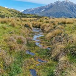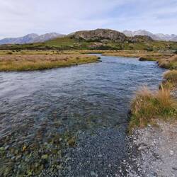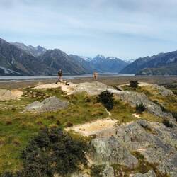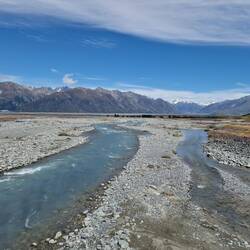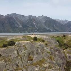 Mount Sunday thront wie ein bescheidener Hügel, der sich aus der gigantischen Weite der Ebene erhebt, über dieser. Ringsum wogt welliges Grasland, bevölkert von Schafen, und flinken Hasen. Kleine, kristallklare Bäche schlängeln sich hindurch, während auf einer Seite das mächtige, sehr breite, steinige Flussbett des Rangitata-Flusses liegt – ein gigantisches, silbrig schimmerndes Geflecht aus unzähligen Armen, das sich wild und frei durch das Tal windet, als wollte es die ganze Landschaft umarmen.