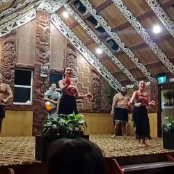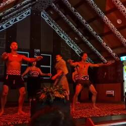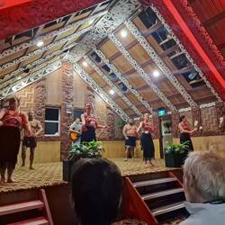 Dann sahen wir die kulturelle Performance: Traditionelle Begrüßung (pōhiri) zwischen zwei Stämmen vor dem typischen Haupthaus. Darauf folgte die formale Einladung ins Innere mit Gesang, Tänzen, Poi-Spiel und natürlich dem Haka. Der Haka ist der intensive Kriegstanz mit den berühmten Grimassen, weit aufgerissenen Augen und der herausgestreckten Zunge. Er ist eine Demonstration der eigenen Stärke und Einschüchterung der Gegner mit der Botschaft „Ich werde dich besiegen und danach essen“.
