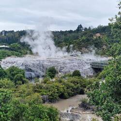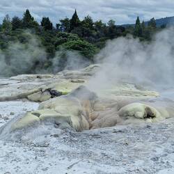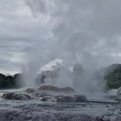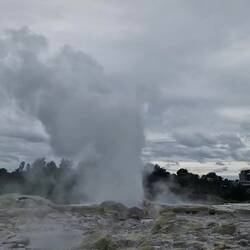 Die Geothermal-Landschaft auf dem gleichen Gelände war stinkig interessant. Brodelnde Schlamm-Pools und der berühmte Pōhutu Geysir – der größte aktive Geysir der Südhalbkugel. Etwa ein bis zwei Mal pro Stunde entlädt sich unterirdischer Wasserdruck in die Höhe. Manchmal konzentrierter und höher, manchmal flacher, dafür breiter.