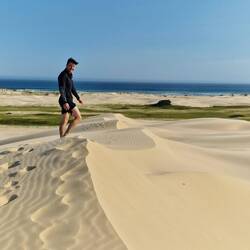 Am Strand bei Anna Bay genossen wir zum ersten Mal in diesem gemeinsamen Urlaub das noch erfrischend kühle, salzige Wasser und spazierten durch die dahinterliegende Dünenlandschaft.