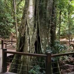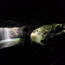 Von der Gold Coast ging es zunächst zum Springbrook National Park, der für eine hier so genannte Natural Bridge bekannt ist. Es handelt sich um eine natürliche Felsbrücke oder eher einen Bogen, welcher durch Erosion eines kleinen Flusses in einer Basalt-Höhle entstanden ist. Hier führt ein kurzer Rundweg etwa einen Kilometer durch dichten, uralten Regenwald vorbei an spannendem Grün zu diesem Highlight. Tagsüber sieht man den kleinen Wasserfall, der durch die Öffnung im Felsbogen direkt in die Höhle darunter stürzt. In der Höhle leben kleine Fledermäuse die auch Tagsüber hier aktiev sind. Besonders bekannt ist die Höhle aber nachts wegen der Glow-Worms: Tausende leuchtende Fliegenlarven, die ich aus Neuseeland kenne.