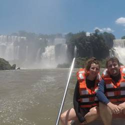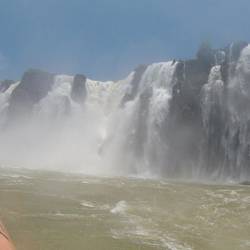 Und da war es auch schon soweit. Ein weiteres Naturweltwunder auf der Liste. Es ging früh los, da wir die Grenze nach Argentinien übertreten mussten und hierfür ein wenig Zeit in Anspruch genommen werden musste. Nachdem wir wieder einen Stempel im Pass bekamen (auf der Reise bereits der zweite in Argentinien), fuhren wir weiter zum Nationalpark. Dort angekommen, war es in Argentinien 8:00 Uhr und wir waren pünktlich zur Öffnung des Parks dort (in Brasilien war es hingegen 9:00 Uhr). Das erste Ziel sollte der Garganta del Diablo („Teufelsschlund“) sein. Dies ist ein U-förmiges Schluchtensystem, die sich innerhalb der knapp 2,7 Km langen Iguazú-Wasserfällen befindet. Alleine der Teufelsschlund ist ca. 700 Meter lang und 150 Meter breit und die Fälle sind zwischen 64 Meter und 82 Meter hoch. Nach einer indianischen Sage haute einst ein Gott aus Wut mit der Faust auf die Erde, da eine ihm geopferte Jungfrau floh. Das Wort Iguazú stammt auch aus einer indianischen Sprache und bedeutet soviel wie „grosse Wasser“. Mit der kleinen Parkbahn ging es dann zu einem Wandersteg, bei denen man noch 1,1 Km über das Wasser laufen musste. Bereits nach wenigen Metern liefen uns dann auch die ersten Nasenbären über den Weg, die sich aber nicht von den umherlaufenden Menschen beirren ließen. Heute schien die Sonne hell vom Himmel und wir waren froh, dass das Wasser uns leicht abkühlte, so näher wir an die Fälle kamen. Der Ausblick war jedoch wirklich atemberaubend und unglaublich nass. Also wir wurden hier komplett nass, ohne dem Wasserfall auch nur allzu nahe zu kommen. Es tat an diesem heissen Tag aber unglaublich gut. Wir genossen die Aussicht von dem Plateau und konnten von hier auch die brasilianische Seite gut sehen. Nach dem Genuss des Teufelsschlunds ging es dann wieder zurück zur Parkbahn, wo wir eine Station zurückfuhren und dann eine Wanderung auf den oberen Ebenen der Fälle machten. Die Aussicht und das Wetter war super und wir konnten das ganze Tal sehen und wie es sich hier erstreckte. Es war grün und dazwischen fanden sich immer wieder größere und kleinere Wasserfälle, wo das Wasser laut runterplätscherte. Die Naturkräfte, die dabei entstanden, nutzten die Geier und anderen Vögel, um sich Auftrieb zu holen und über das Tal zu gleiten. Auch sah man immer wieder Vögel hinter einzelnen Wasserfällen verschwinden, die dahinter wohl nisten. Wir machten nach der kurzen Wanderung dann eine Essenspause, bei der uns die südamerikanischen Nasenbären das Essen klauen wollten. Wir zogen uns unsere Badesachen und UV-Shirts an (aufgrund der Hitze waren die anderen Sachen ohnehin schon trocken) und dann fuhren wir mit einem Jeep durch den Regenwald zu einem Speedboot. Wir bekamen eine Rettungsweste, ein Drybag für unsere Sachen und dann fuhren wir den Fluss aufwärts. Was wir dank Pili wussten, ist, dass die Speedboote auch unter dem Wasserfall entlangfahren und man daher klatschnass wird. Dadurch konnten wir uns entsprechend präparieren. Andere wussten es jedoch nicht und wurden dann auch richtig nass. Man bekam erst ein wenig Panik unter dem tosenden Wassermassen, aber man konnte das kühle Nass auch richtig genießen. Wir hatten eine Menge Spaß und dann war es leider auch schon wieder vorbei. Nachdem wir wieder im Nationalpark angekommen sind, ging es auch schon wieder nach Brasilien und unser zweiter kurzer Argentinienausflug war auch schon wieder vorbei. Am späten Nachmittag waren wir auch wieder im Hotel, wo Chris sich dann schlafen legte (er war immer noch nicht ganz fit) und Steffi mit den anderen auf den örtlichen Weihnachtsmarkt ging und dort die Stände und die Ballettaufführungen sah. Weihnachtsmarkt bei knapp 30 Grad ist halt auch was anderes.Baca lagi