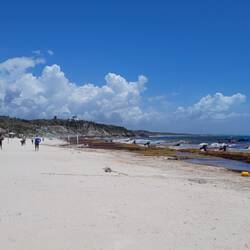 Am ersten Tag liehen wir uns Fahrräder aus und fuhren die paar Kilometer bis zum Strand. Wie wir vorher schon erfahren hatten, hat Tulum jedoch seit einiger Zeit große Probleme mit Seegras. Am Strand angekommen konnten wir erahnen warum die Strände um Tulum zu den schönsten des ganzen Landes zählen. Der Sand war sehr weiß und weich und überall standen Palmen. Leider war im Wasser und an Land aber meterweit alles voller Seegras. Das hat nicht wirklich zum Baden eingeladen. Also fuhren wir weiter und dann auch schon bald wieder zurück zu unserer Unterkunft. Zum Glück hatten wir ja einen schönen Garten mit Pool.