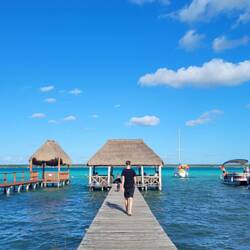 Nach den entspannten Tagen in Tulum ging es weiter in den zweiten Ort unseres kurzen Mexikotrips - Bacalar. Bacalar ist eine kleine Stadt ganz im Südosten der Yucatan Halbinsel. Kurz vor der Grenze zu Belize. Bekannt ist die schöne Kleinstadt für die wunderschöne Lagune der 7 Farben. Diese besteht aus 7 Cenoten, die sich verbunden und einen riesigen Süßwassersee gebildet haben, der wunderschön türkisblau leuchtet. Die Lagune der 7 Farben heißt so, weil sie 7 verschiedene Blautöne haben soll. Wir fanden die Farben der Lagune sehr beeindruckend, 7 verschiedene Blautöne konnten wir aber nicht ganz zählen 😀 Bacalar erstreckt sich an der Lagune entlang und wirkt wie eine Stadt am Meer mit vielen Palmen, bunter Streetart und vielen Stegen von denen man in die recht warme Lagune springen kann.