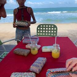 Später kommen noch andere Strandläufer und die Taschen werden größer, auch Schmuck kommt dazu, alles kunstvoll hergestellt für die Strandtouristen. Während sich die Mädels die Taschen anschauen, finde ich ein Dutzend Hundewelpen interessanter und verewige sie auf dem hier verlinkten Video.
