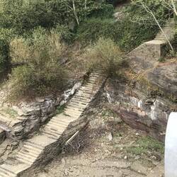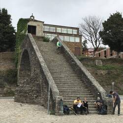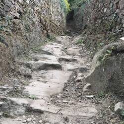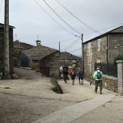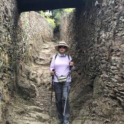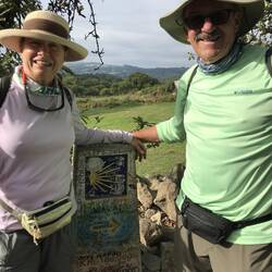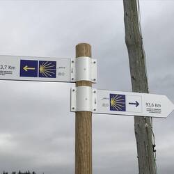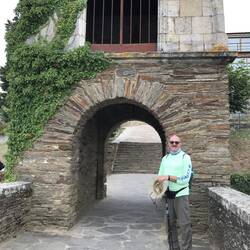 When we scouted the route last night, the Camino took us right to a city staircase that could have been the inspiration for the stairway to heaven song. Ever resourceful, we found a gentler, kinder route that still involved some serious incline to connect with the Camino. After listening to our new Camino friends talk about their experiences with nuns, Mike has a new theory. He thinks that the route was laid out by the nuns of old, to give those pesky pilgrims ample opportunities for penance. Once outside the city we walked through an enchanted forest with moss covered rock walls lining the path, massive ancient chestnut and oak trees as well as the occasional babbling brook. Disappointed that the dim light meant the camera couldn't do it justice, we tried to engrave it in our memories. Even the sounds of the forest are magical. Speaking of sound, we have grown quite accustomed to the quiet footsteps on the path accompanied by sounds of nature and the land, punctuated by the occasional "hola" and "Buen Camino". We were warned that the peace and quiet would go by the wayside once we got to Sarria. Even so, we weren't quite prepared for the "John Wayne rounding up his posse to go get us some Camino" scenario we encountered at breakfast. We downed breakfast as quickly as we could and hit the trail, hoping to stay ahead of the crowd. We skipped over the first hamlet offering coffee and pressed on to Morgade. We ran into Everett, our Dutch friend, who was having a low spell dealing with shin splints and not sure if he would be able to finish the Camino. After exchanging shin splints tips, we added a pep talk geared towards the school administrator that he is. At this point we are within a week of graduating. Even if we have to crawl on our hands and knees to Santiago, we will make it. He laughed, point well taken. Just past Morgade we went by the 100 kilometers to Santiago marker. That makes it official, we are now 2 digit midgets! Since we entered the Galician region, we noticed a change in the markers. All the others gave distance in kilometers, maybe including one decimal point. The Galician markers spell it out in meters. Guess the message is that as we enter the homestretch, we should savor every meter. We finally made it to Portomarin ahead of the projected rain. Good thing too, as the descent to the river before the city was through a long, steep and rocky ravine, payback for having skipped those steps in Sarria no doubt. We crossed a modern bridge into Portomarin, then climbed a few more staircases up to town. Portomarin has been relocated from its original location on the river. Back in the 50-60's, Franco built a dam to create the Belesar reservoir and hydroelectric plant. The original town was soon submerged, so the townspeople disassembled the church and historic buildings, brought them uphill stone by stone, and reassembled them. You have to admire that dedication to preserving history.Leia mais