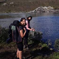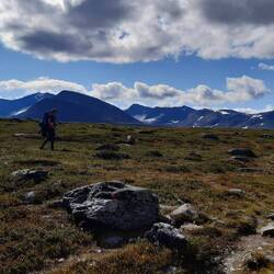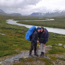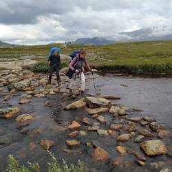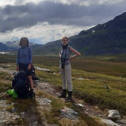 Nach einer Nacht, die kaum Dunkelheit gebracht hat, starten wir den Tag mit Freiburger Premium Café von Schwarzwild auf der Mokka Kanne, einen Luxus, den wir uns als Kaffeeliebhaber gönnen und Leo schleppen muss (er wollte sie selber unbedingt mitnehmen!). Danach verlassen wir den sehr schönen, wenn auch vollen Zeltplatz und glücklicherweise lassen wir auch die nicht so schönen Plumpsklos hinter uns. Nach einer Hängebrücke über dem Fluss bewegen wir uns leicht bergauf und die Birken werden nach und nach durch Heide und Gestrüpp ersetzt. Lila Blumen, Beeren und weiße Holunder -ähnliche Pflanzen wachsen neben den Wegen und Holzstegen, die über den Sumpf führen. Immer wieder fliegt eine verirrte Möwe über uns, die vermutlich eine Entdeckungsreise von der norwegischen Küste ins Landesinnere vorgenommen hat. Wir wandern gemütlich vor uns hin, setzen gelegentlich die Rucksäcke ab und vespern Knäckebrot mit Erdnussmus zum Mittag. Irgendwann wird aus dem wunderbar blauen Fluss ein See, der mitten im Fjäll auftaucht: der Abiskojärvi. Zur einen Seite ist der See, zur anderen Seite blickt uns die Westflanke des 1550 m hohen Giron an, der somit etwa 1000 Meter von uns aus in die Höhe ragt. Am Ende des Sees kommen wir zur STF (Svenska Turist Föreningen) Hütte, die sowohl Zeltplätze am Ufer als auch Schlaflager, Küche und einen Laden mit Lebensmitteln bietet. Zum Empfang bekommen wir, obwohl wir nicht über Nacht bleiben, einen Beerensaft und können uns danach noch im Laden umschauen: Mayo und Käse aus der Tube und geräuchertes Rentierfleisch ist zwar nichts für uns, aber Schokokekse und einen Stoffsticker als Souvenir nehmen wir für ca. 7€ zusammen mit. Nach der Hütte wollen wir noch ein bisschen Strecke machen und verlassen recht bald den Abisko Nationalpark und auf ins wilde Fjäll! Ein Rentier Zaun und ein paar eindeutige Hinterlassenschaften lassen die Nähe der nordischen Tiere vermuten, doch wir bekommen noch keins zu Gesicht. Nachdem wir noch einen "Meditationsplats" passieren und uns durchs Gestrüpp zum Waschen zu einem Bach schlagen finden wir einen tollen Zeltplatz, wo wir dieses Mal ganz allein sind und entspannt Abendessen können. Bei einem leichten Nieselregen taucht ein Regenbogen das Gebirge in tolles Licht und allmählich fühlen wir uns richtig abenteuerlich...Read more