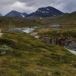Für heute morgen stellen wir uns ausnahmsweise einen Wecker, um früh loszukommen, aber um 7 Uhr ist es auch sowieso schon ziemlich warm in Zelt. Der Grund für unseren früheren Aufbruch ist, dass wir Proviant in der nächsten Hütte Alesjaure einkaufen wollen, aber die hat morgens nur von 8-10 Uhr offen. Zwar kommen wir etwas später los als geplant und müssen auch noch ein paar Bachläufe überqueren und dafür Mal die Schuhe ausziehen, aber wir kommen um 20 nach 10 Uhr an und freundlicherweise lässt uns der Hüttenwirt noch rein und wir dürfen im Laden noch ein paar Sachen besorgen. Während wir uns freuen, wieder mit Brot, Nudeln, Schokolade und weiteren Dingen versorgt zu sein, ziehen zunehmend dicke graue Wolken auf. Kurz nach uns treffen an der Hütte zwei Deutsche ein, die aus Richtung Süden kommen und nach Abisko wandern und uns nach der Wasserproblematik fragen. Bisher haben wir das Wasser aus fließenden Flüssen und Bächen einfach so getrunken und nur ein Mal eine Tablette zur Desinfektion reingeschmissen. Anscheinend ist Richtung Tjäktja, wo wir heute hinwollen, ein Tier verendet und mehrere Leute, die das Wasser getrunken und nicht vertragen haben, mussten mit dem Heli abgeborgen werden. Man soll das Wasser bestenfalls abkochen oder einfach nichts trinken... Hm, das klingt ja gar nicht gut. Wir trinken nochmal richtig viel von dem Wasser, was wir noch haben und dann machen sich Leo und Charlotte auf den Weg noch Mal "frisches sauberes Wasser" zu holen, während ich meine entzündeten Mückenstiche schone und noch Mal beim Hüttenwirt nach dem Wasser frage. Er weiß von nichts und meint, das Wasser zu trinken ist eh immer eigenes Risiko. Gut hydriert und mit Erdnussbutter -Broten gestärkt machen wir uns auf den Weiterwege Richtung Tjäktja und überqueren Mal wieder auf einer wackeligen Hängebrücke einen schön mäandrierenden Fluss. Neben Möwen kreist hier auch ein großer schwarzer Vogel über uns, vielleicht ist es ein Adler. Von hier an wird die Landschaft zunehmend rauer, die Bergrücken schroffer, die Vegetation sparsamer und beiderseits des Tals fließen aus Gletschern und Schneefeldern Bäche und Wasserfälle. Auf unserem Weg müssen wir immer wieder auch etwas breitere Bäche überqueren und dabei aufpassen, dass wir nicht mitsamt der Rucksäcke stolpern und nass werden. Über uns hängen graue Wolken, ab und an tut sich ein Stückchen blauer Himmel auf und die Sonne schaut heraus. Insgesamt erinnert die Szenerie an mystische Geschichten und Filme wie Herr der Ringe.