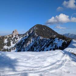 Dieser dann wieder mit Schnee bedeckt und teilweise ausgesetzt hat mich überzeugt, doch meine Grödel anzuziehen und die bessere Trittsicherheit zu genießen. Sehr wohl hat sich das gelohnt und die Kammwanderung bis zum Gipfel des Risserkogel (1826m) war atemberaubend. Ein phänomenales Panorama mit dem hinteren Teil des Tegernsees und der umliegenden Alpenlandschaft. Selbst der im entfernten Tal liegende Sylvensteinspeicher lies sich durch das Schimmern des Wassers in der Sonne erkennen.