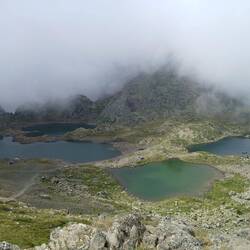 Am späten Nachmittag peilen Helena und ich eine kleine Spitze neben den Seen an. Erst finde ich den Weg beim Einstieg nicht, wobei dieser steil eine Mischung aus Gras, Geröll und Fels hoch geht. Ein Stück höher hält Helena an und ich eile alleine zur Spitze. Auf dem Weg erschrecke ich eine Gamsfamilie und aufgrund der Sichtverhältnisse bin ich sehr schnell wieder unten. 10min später klart es ein bisschen auf und ich hätte zumindest die Seen von oben gesehen. Noch eine kleine Runde um einen See und dann zurück zur Hütte, um das Abendessen vorzubereiten. Zwei Männer übernachten ebenfalls in der Hütte, wovon einer den Hexatrek und der andere eine Runde um Grenoble wandert.