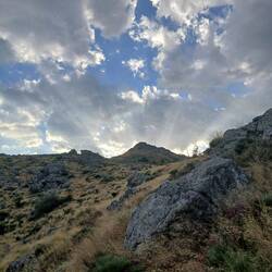 Der letzte Anstieg geht die Bergseite hoch, wo ich ein bisschen genervt bin, da ich mit meinen abgelaufenen Schuhen sehr leicht auf dem trockenen und staubigen Boden mit Geröll rutsche. Nach dem ersten Teil klettere ich auf einen kleinen Felsen und genieße die Aussicht. Am Ende des hochgelegenen Tales kommen wir an eine schöne Hütte zwischen Ruinen, in der wir Salz und Kurkuma finden, wovon meine Handinnenfläche danach ganz gelb ist. In der angehenden Dunkelheit steigen wir bis zum Ourtigas Pass hoch, wo wir zwei Autos auf einem Seitenstreifen vorfinden. Die auf der Karte markierte Bank in der Nähe stellt sich als sehr ungeeignet heraus. Wir hoffen darauf, dass die Personen von den Autos irgendwo auf dem Berg übernachten und legen uns neben ein Auto an den Rand.