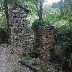 Ab der Hälfte des Abstiegs gehe ich vorraus, da ich kaum noch Wasser habe. Ich stoppe bei einer Kreuzung, wobei der eingezeichnete Bach in der Nähe trocken liegt. Also bis runter zum Dorf, wo ich mir direkt am Fluss die Flasche auffülle und meinen Rucksack bei einem anderen HT Wanderer lasse. Im Eiltempo folge ich meinem Weg zurück den Berg rauf. Nach 100 Hm setze ich mich in den Schatten und warte 5min. Keine Anne zu sehen. Ich renne runter zum Fluss und frage den HT Wanderer, ob er Anne gesehen hat, aber auch er hat keinen Wandernden über die Brücke laufen sehen. Also nochmal ein Stück den Berg hoch und wieder warten, wobei es mir sehr komisch vorkommt, da schon zu viel Zeit vergangen ist. Im letzten Stück vor dem Dorf weist ein Schild auf eine geänderte Wegführung hin, wobei man nur am anderen Ende sieht, dass hier ein Haus gebaut wurde und der Weg nicht mehr existiert. Ich komme wieder am Fluss an und auf einmal ist noch ein HT Wanderer, Merlin hier, den ich verpasst habe. Er hat Anne nicht getroffen und da wird mir klar, dass Anne wohl an mir vorbei ist, an dem Stück, wo der Weg eigentlich umgeleitet wird, wo ich wohl auch Merlin verpasst habe.