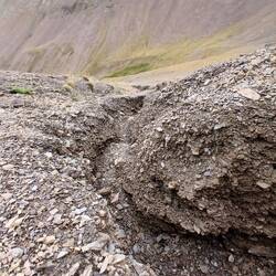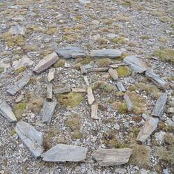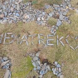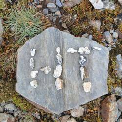 Wie ich einen sechseckigen Stein finde, suche ich kleinere Steine um "HT" darauf zu legen und platziere diesen neben den Weg. Etwas weiter auf dem Kamm lege ich aus länglichen Steinen ein Sechseck mit "HT" in der Mitte und weil das nicht genug ist, lege ich an der Pic de les Nou Fonts (2861m) eine noch größere Markierung, wobei ich ggf. einen Steinhaufen dafür aufopfere. Damit habe ich erstmal genug des Guten, bis mich ein weiterer sechseckiger Stein anlächelt, für den ich kleine weiße Steine als Kontrast sammle. Währenddessen kommt mir die Idee zum Schluss, bevor wir absteigen, "HEXATREK" zu legen, welches ich mit einem Herz der übrigen Steinchen ergänze.