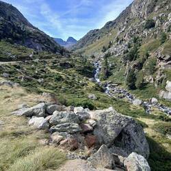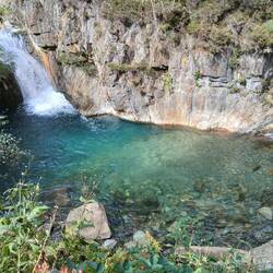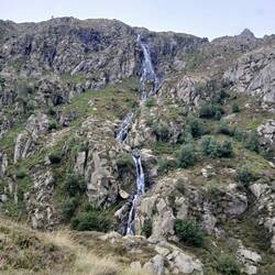 An der Kappelle genießen wir im Schatten unser Mittagessen. Nach einer kurzen Pause starten wir einen langen Anstieg, bis wir irgendwo über 2000Hm einen schönen Zeltplatz finden. Ich suche eine alternative Route raus die 400m länger ist und an zwei Wasserfällen vorbei geht. Was ich leider nicht sehe, sind die 1,5km, die wir langsam auf einem kaum begangenen Weg zurücklegen und dabei noch einen Fallbach durchqueren, wo es wie am Morgen nur für mich mit einem Sprung rüber geht. Zurück auf dem HT bzw. HRP, dem wir hier wieder folgen, gibt es einen gut ausgetretenen Wanderweg das Tal hoch. Vorbei an einem hohen Stufenwasserfall kommen wir in eine Senke auf 1900Hm, wo der Bach schön in kleinen Schleifen sich durch die karge Landschaft zieht. 100m höher schaue ich mir eine Steinhütte an, wobei ich doch lieber mein Zelt aufstelle, als darin zu schlafen. Also nochmal 100m höher auf die nächste Ebene, wo ich meinen Rucksack an einem Felsen abstelle, um nach flachen Stellen zu suchen. Anne nimmt ihren direkt mit und ich hole meinen nach wenigen Metern ebenfalls, da es ein Stück weiter einen geeigneten Platz gibt.