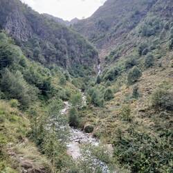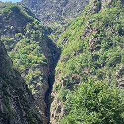 Wir finden einen netten Felsen direkt an einem seichten Seitenarm des Baches, wo ich meine Füße reinhängen kann. Anne kratzt den Rand ihrer Magic Jar sauber und plötzlich kullert diese über den Felsen und plumst ins Wasser. Während ich ins knietiefe Wasser springe und die Dose rette, bekommt Anne sich vor Lachen nicht mehr. Zum Glück ist der Inhalt noch halb festgefroren, weshalb das nichts ausmacht, aber der Moment, wie die Magic Jar ins Wasser fällt, war schon sehr lustig. Vorbei an einem beeindruckenden Wasserfall folgen wir nun einer Straße, die uns an einem Stausee entlang weiter ins Tal führt. 3 km vor der nächsten Toilette haben wir es davon, wie anstrengend Pinkeln ist, wenn man gleichzeitig groß muss, aber noch aushalten will.