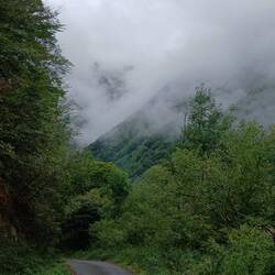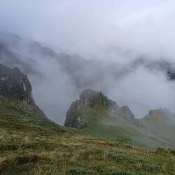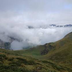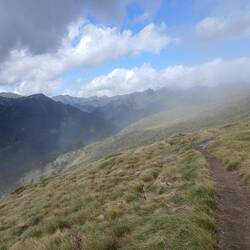 Zum nächsten Pass führt zum Großteil ein ehemals gut ausgebauter Weg. Auch der Abstieg ins Tal verläuft sehr entspannt am Berg entlang und dann in großen Serpentinen. An einer Infotafel hänge ich meine teils noch feuchten Sachen auf und genieße mein Mittagessen, was mal wieder einen Bowist beinhaltet. Der nächste Anstieg folgt anfangs wieder einem Schotterweg und biegt dann aber sehr steil in ein Seitental ab. Auf halber Höhe höre ich Tierlaute, die für mich nach einem Bär klingen, wobei ich lediglich Kühe finde. Kurz vor dem Pass umhüllt mich eine Wolke und die Sicht beschränkt sich auf wenige Meter. Im Abstieg befinde ich mich ineinem Geröllfeld, bis ich einer Wiese zur nächsten Wegkreuzung folge. Der See neben mir versteckt sich in der Wolke und so steige ich direkt zum nächsten See ab.